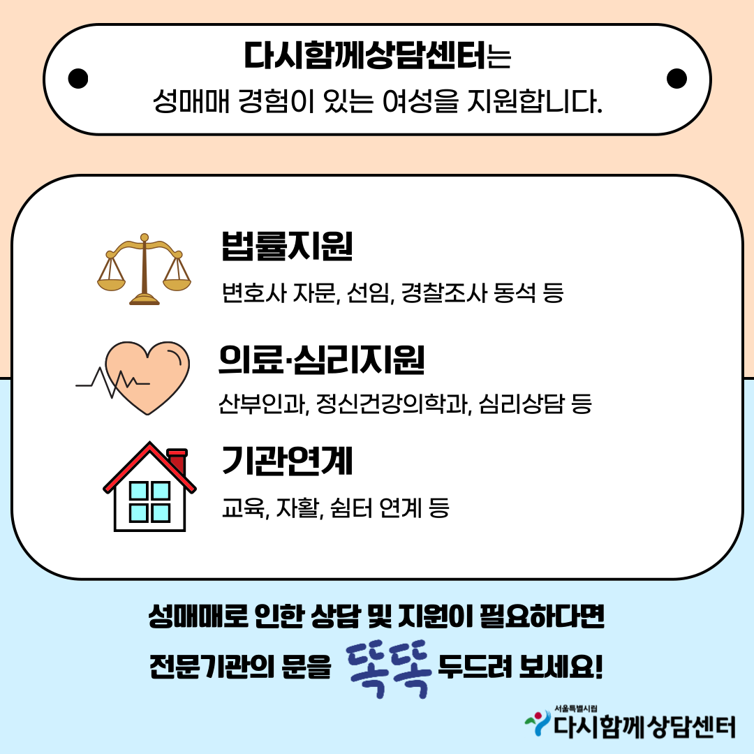 성매매 경험으로 인한 트라우마를 경험하고 있거나 목격하였다면, #다시함께상담센터 의 도움을 받아 마음을 안전하게 돌보며, 일상을 회복하면 좋겠습니다. (주변에 성매매 트라우마 등으로 어려움을 겪고 있는 사람이 있는 경우, 센터를 안내하여 주세요)