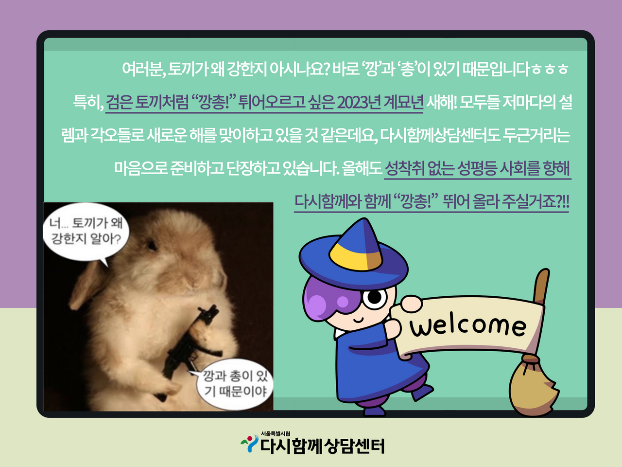 특히, 검은 토끼처럼 "깡총!" 튀어오르고 싶은 2023년 계묘년 새해! 모두들 저마다의 설렘과 각오들로 새로운 해를 맞이하고 있을 것 같은데요. 다시함께상담센터도 두근거리는 마음으로 준비하고 단장하고 있습니다. 올해도 성착취 없는 성평등 사회를 향해 다시함께와 함께 "깡총!" 뛰어 올라 주실거죠?!!
