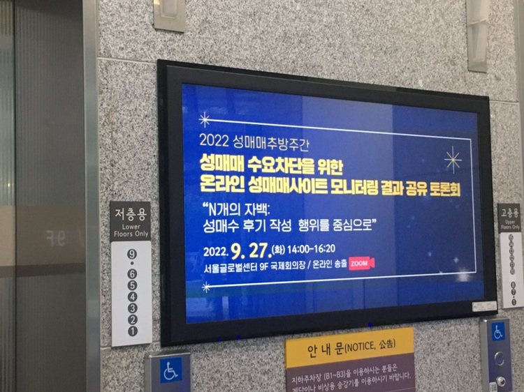 지난 11월 8일, 다시함께상담센터 감시사업팀은 동작구청이 시행하는 ‘유흥주점 성매매방지 게시물 부착 점검’ 활동에 동행하였습니다. 「식품위생법」시행령 제21조 제8호 라목에 의한 유흥주점은, 유흥종사자를 두거나 유흥시설을 설치할 수 있고 손님이 노래를 부르거나 춤을 추는 행위가 허용됩니다. 따라서 2012년부터「성매매피해자보호법」(성매매방지 및 피해자 보호등에 관한 법률 제32조 제1항)에는 유흥주점 영업장의 출입구 등 눈에 잘 띄는 곳에 성매매 방지 및 피해자 보호를 강화하는 내용의 게시물을 부착하도록 규정하고 있습니다(하단 이미지 참조). *2022.11.08. 동작구와 함동점검 당시 촬영한 동작구내 유흥업소내 해당 게시물 행정기관은 일정 기간을 정해 각 관내 등록된 전체 업소에 대해 게시물 부착 여부, 게시물의 크기, 모양, 재질, 게시 장소, 문구 내용 등을 점검하도록 되어 있는데요. 만일 게시물 미부착시에는 과태료가 처분되며(1회 150만원, 2회 300만원, 3회 이상 500만원), 게시물 재질이나 내용 등이 맞지 않을 경우 10일 이내 변경 및 개선해야 합니다. 다시함께상담센터 감시사업팀이 동행한 유흥주점 업소 중 80%가량 업소는 게시물이 제대로 부착되어 있는 것을 확인하였습니다. 게시물이 미부착되어 있는 나머지 업소들에 대해서는 동작구청의 안내에 따라 추후 재검검 등을 통해 개선 사항 확인 절차가 완료되었습니다. 이번 합동점검이 유흥주점 내 성매매가 불법이라는 경각심을 다시 한 번 일깨우는 계기가 되었기를 바랍니다. 성매매를 사전에 방지하고 성매매 알선 산업을 축소하는 데 있어, 앞으로도 주기적으로 유흥주점 내 성매매 방지 게시물 부착 안내가 지속되어야 하겠습니다.