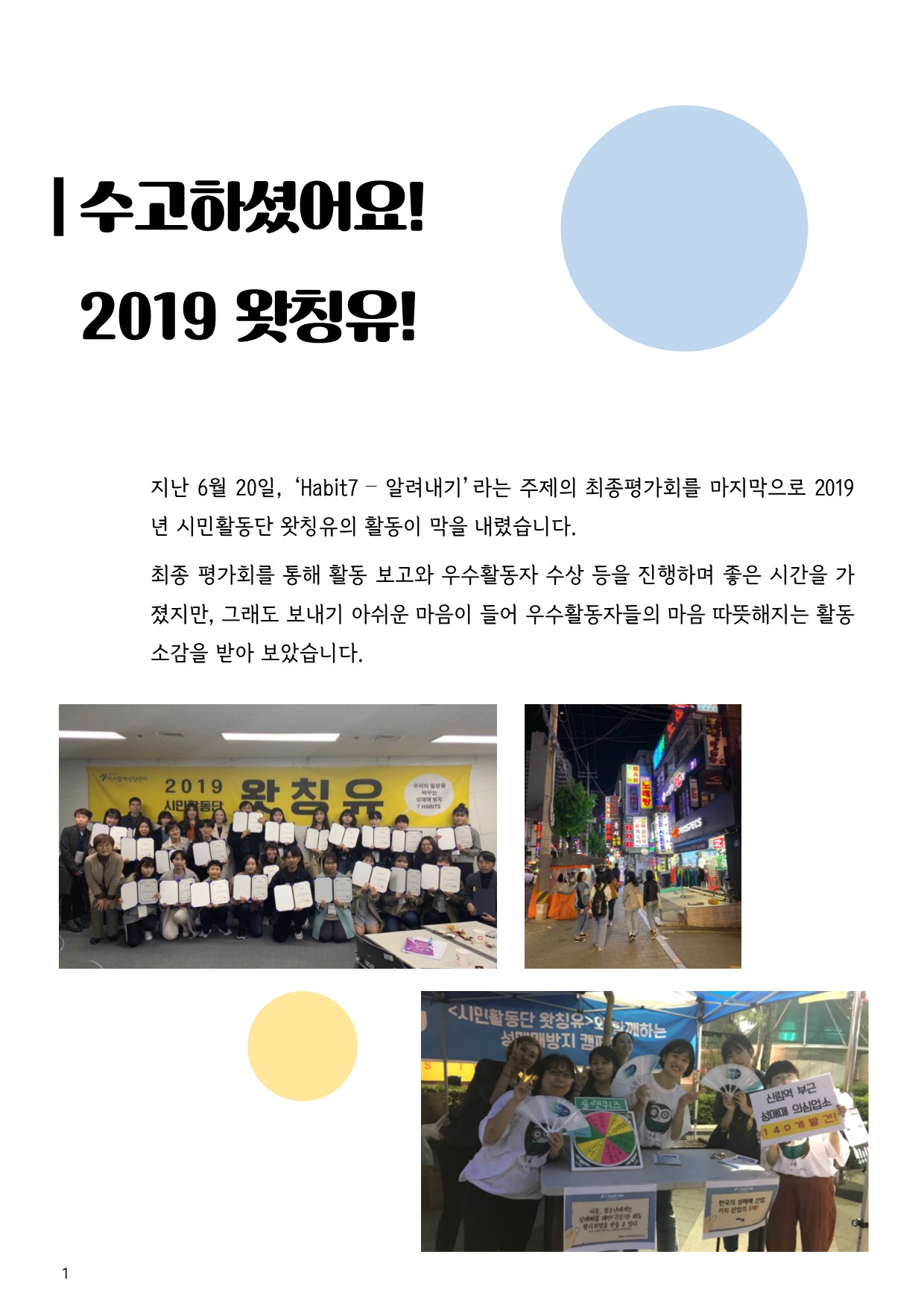 “인터넷시민감시단”과 “왓칭유”를 위한 올해 두 번째 힐링프로그램을 10월 24일 진행하였습니다. 식사 후 자리를 옮겨 돌아가며 간단히 자기소개하는 시간을 가졌습니다. 관람한 연극은 <오펀스>로 ‘젠더프리캐스팅’으로 화제를 모은 작품이었습니다. ‘젠더프리캐스팅’이란 젠더가 고정되어있는 배역일지라도 누구에게나 배역을 맡기는 방식을 가리킵니다. 김태형 연출가는 “가치 있는 이야기라면 화자가 남자인가 여자인가는 중요치 않은 것 같다”며 “위로와 격려를 통해 각자의 벽을 허무는 이야기가 여성의 입으로 전해질 때 또 다른 강력한 힘이 있을 것이라 믿는다”고 설명했습니다. 연극계의 이러한 변화는 연극계가 미투 운동의 중심에 섰던 것과 무관하지 않다는 분석이 나오고 있습니다. 의미있는 연극을 관람할 수 있어 더욱 좋았습니다.‘환풍구’는 건물 안의 탁한 공기를 밖의 맑은 공기과 바꾸기 위해 뚫어놓은 구멍이라는 것 다들 아실 텝니다. 인터넷시민감시단은 성매매 광고 계정을 신고하고, 음란물을 신고하기 위해, 결국 성매매 광고를 찾아내고 음란물을 찾는 과정을 필수적으로 거쳐야 하죠. 왓칭유분들 또한 수많은 성매매업소를 감시하고 이를 광고하고 유통하는 산업에 대해 예의주시하고 계십니다. 그 과정에서 생기는 스트레스를 간과할 수 없을 겁니다. 지난 10월 진행한 ‘환풍구’를 통해 내면에 고인 탁한 공기를 맑은 공기로 대체할 수 있으셨길 바랍니다.또 한편 프로그램을 준비하며, 다시함께와 함께 해주시는 시민분들이 ‘환풍구’ 그 자체라는 인상을 갖게 되었습니다. 결국 온라인과 오프라인에 고여있었을 불법성산업이라는 탁한 공기가 여러분의 활동을 거쳐 꾸준히 맑은 공기로 바뀌고 있다는 것 늘 잊지 않아주셨으면 합니다. <참고자료> 국민일보, “남녀 역할 경계 허문 젠더 프리 캐스팅 연극이 꽃핀다”